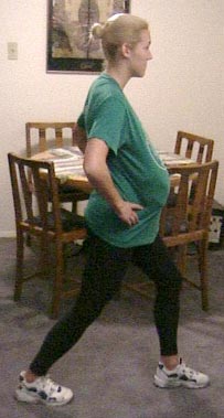 4. Calf Stretch - Place one leg out behind , with both feet flat on the floor and the and both feet pointing straight ahead. Tilt the pelvis backward (or under) to prevent arching in the lower back. Once stretch is completed for one calf switch sides. If support is needed place hands on wall. * To stretch the lower calf, bring the feet closer together and bend both knees slightly.